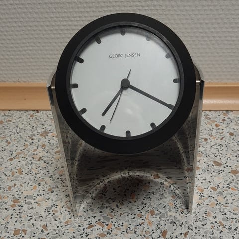 Sælger dette stilrene og ikoniske Koppel bordur fra Georg Jensen. Uret har en sort ramme, hvid urskive og et elegant, minimalistisk udtryk. Designet af Henning Koppel og fremstillet i metal. Diameter: 10 cm.