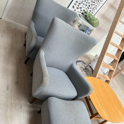 Grå sofa fra myhome møbler og grå lænestol fra ilva gives bort mod afhentning enten søndag d. 18. eller mandag d. 19. januar. Der er et lille hul på siden af lænestolen.