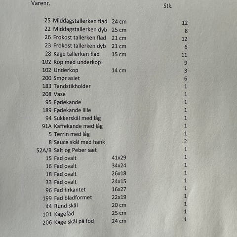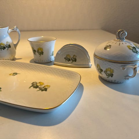 Spisestel div. 12 dybe ø 24 med intakt guldkant, 10 flade ø 24 med intakt guldkant, 4 fade, 2 skåle, 2 sovseskåle, 2 lysestager, 1 mini vase, 3 små assietter. 1 peberbøsse. Samlet pris 2500,-