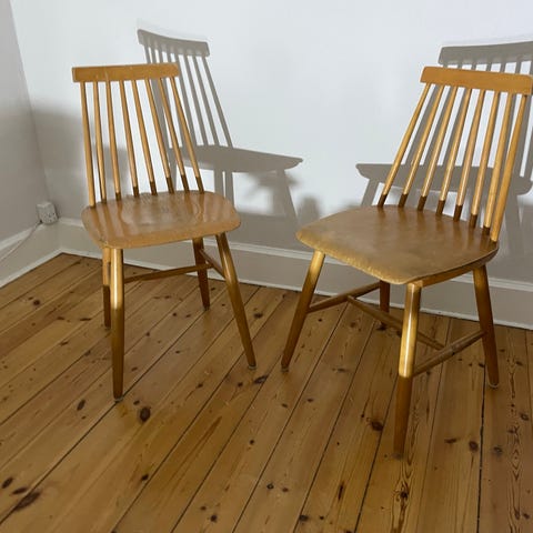 Stolene fremstår i pæn, original stand med naturlig patina og almindelige brugsspor.