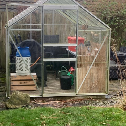 Drivhus med ramme i metal og glasvægge. Velegnet til dyrkning af planter og grøntsager. Indeholder en dør og har et klassisk design med skråt tag. Kan bruges i have eller på terrasse.