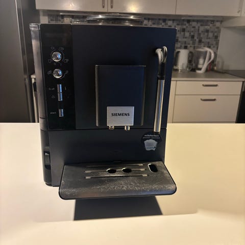 Siemens kaffemaskine i sort farve. Maskinen er designet til at brygge kaffe med forskellige indstillinger. Den har en brugervenlig betjeningspanel og en drypbakke for nem rengøring. Velegnet til hjemmebrug eller kontor.