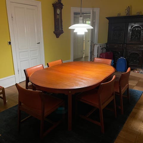 Børge Mogensens klassiske bord i Øresundsserien giver med sit varme egetræ et dejligt blikfang i stuen og kan nemt trækkes ud og blive kæmpestort. Jeg har holdt mange gode middage ved det bord. Bordet er bredt, så der er ægte plads til både fade, blomster og lys. I sin tid købte jeg det hos Bruun Rasmussen, se deres beskrivelse af bordet på sidste foto. Overfladen er sæbebehandlet og har nogle brugsmærker, som jeg en dygtig person kan fjerne med lidt træ-snilde.