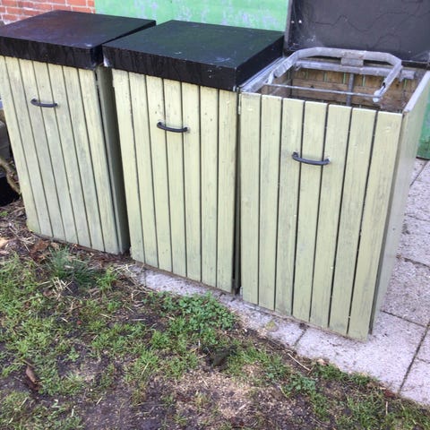 Affaldsbeholder med ydre beklædning i træ og indvendig ramme i metal, udstyret med låg. Velegnet til opbevaring af affald udendørs. Materialerne kombinerer holdbarhed og funktionalitet.