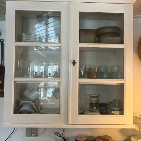 Hvidt vitrineskab med glasdør og glashylder