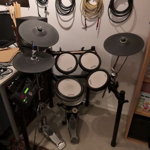 2) En bedre lilletromme (Yamaha Stage Custom, 12 tommer) med meshskind (lydløs) og trigger (Yamaha DT50S Dual Piezo Acoustic Drum Trigger), der er kompatibelt med trommemodulet. Sælges samlet for 700 kr. Stativ (Premier) medfølger gratis.