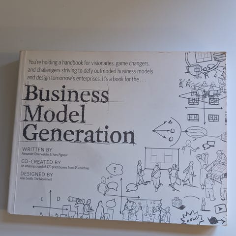 Business Model Generation bog med fokus på forretningsmodeller og strategisk udvikling. Indeholder illustrationer og tekst, der understøtter forståelsen af moderne virksomhedskoncepter.