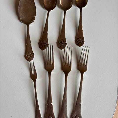 Bestiksæt bestående af skeer og gafler i plet-sølv. Bestikket har dekorative detaljer på håndtagene og er egnet til servering og spisning.