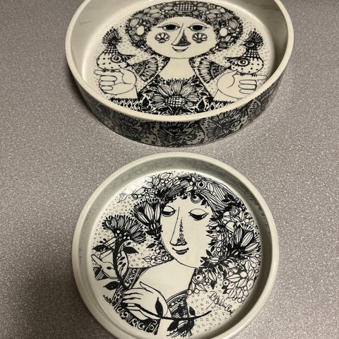 Bjorn Wiinblad keramik fade med sort-hvidt motiv. Fadene har dekorative illustrationer med blomster og figurer i sort på hvid baggrund. Materialet er keramik, og de er velegnede til dekoration eller servering. Lille ikke synligt skår i bunden på begge. Begge 15 cm i diameter. Højde 3 cm. 175 kr. for begge - 100 kr. Pr. Stk.