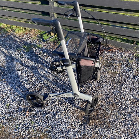 Mobilux Jaguar Rollator med bakke i orange. Rollatoren har fire hjul, et håndtag med bremse, og en integreret bakke til transport af små genstande. Den er designet til at give støtte og mobilitetshjælp. Ser ud som ny. Kun brugt få gange.