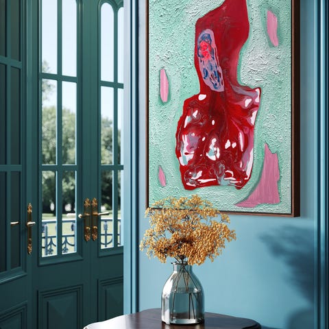 Maleri med abstrakt motiv i farverne rød, sort og blå. Maleriet er indrammet og velegnet til vægophæng i bolig eller kontor.