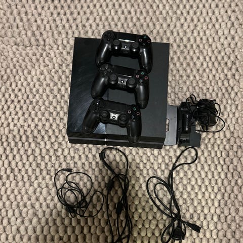 Playstation 4 spillekonsol inklusive tre sorte controllere med kabler. Konsollen er designet til hjemmeunderholdning og gaming. Strømkabel og 2 opladere