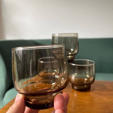 12 stk Franske likør/shotglas glas i tre forskellige farver: grøn, ravfarvet og rød.