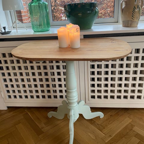 Gammelt charmerende køkkenbord. Synlige dybe ridser i bordpladen. Bordben er forhøjede (se billede). Pga standen denne pris.