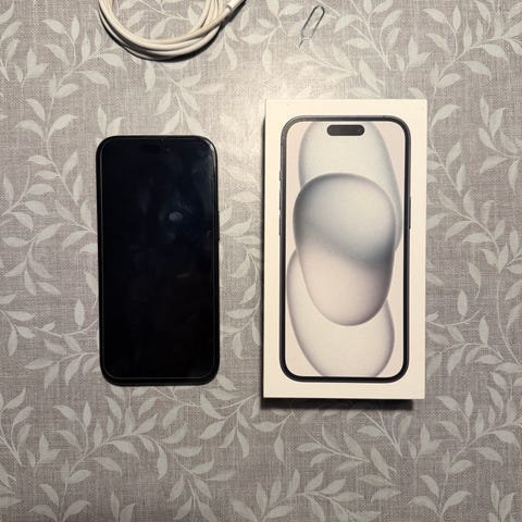 Apple iPhone 15 Pro smartphone med 128 GB lagerplads. Enheden har en skærm med frontkamera og en bagside med tre kameraer. Farven er sølv/grå. Passer til brugere, der ønsker en avanceret mobiltelefon med stor lagerkapacitet.