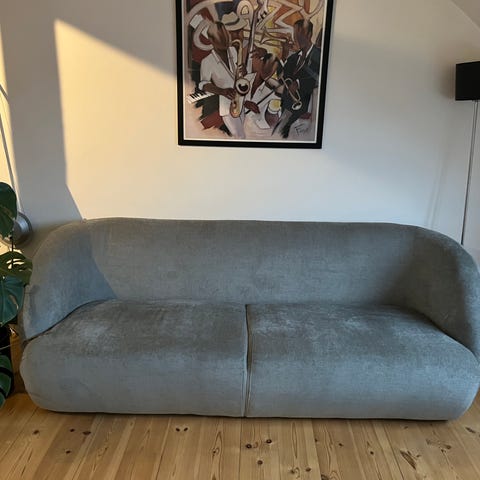 Grå stofsofa med plads til tre personer. Sofaen har polstrede sæde- og rygpuder samt armlæn i samme materiale og farve. Velegnet til stue eller opholdsrum. Sælges da vi flytter og ingen tydelige brugstegn- 108cm bred 217 lang
