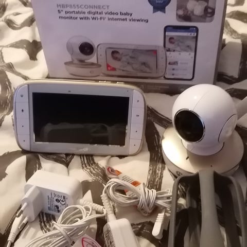 Motorola MBP55 babyalarm med 5 tommer bærbar digital skærm. Enheden består af et kamera og en håndholdt monitor, begge i hvid farve. Designet til overvågning af babyer med trådløs forbindelse mellem kamera og monitor.