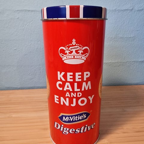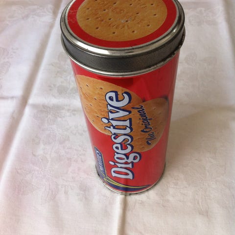 Ældre McVities digestive dåse. Kommer fra røg- og dyrefrit hjem.