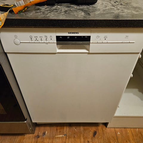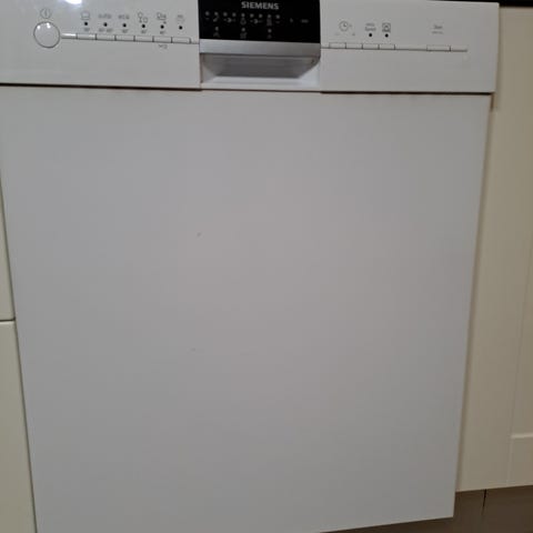 Siemens Underbygget opvaskemaskine. Hvid farve med standardstørrelse og tilslutningsslanger. Designet til indbygning under køkkenbordplade.