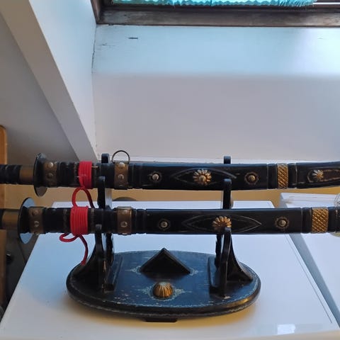 Japansk katana sværd med sort skede. Sværdet har et buet blad og en sort skede, der beskytter klingen. Håndtaget er sort med et mønster af hvide og gyldne detaljer. Velegnet til samling eller dekoration. Skarp men ikke knivskarp. Købte den i Tyskland for 2299kr. Kan ikke bruge fix færdig da jeg sender med gls og det har de ikke herinde men sender gerne