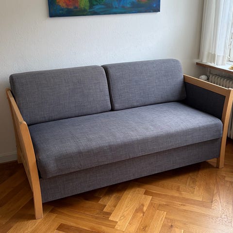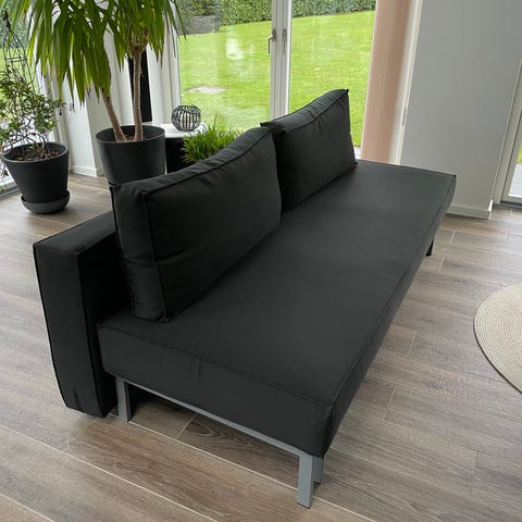 Lille og praktisk sovesofa i gråt stof - brugt som gæsteseng.