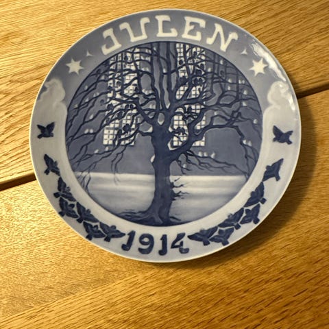 Royal Copenhagen Juleplatte sæt bestående af 12 stk. porcelænsplatter i blå og hvid farve. Platterne har forskellige motiver med jule- og vintertema. Velegnet til samling eller dekoration.