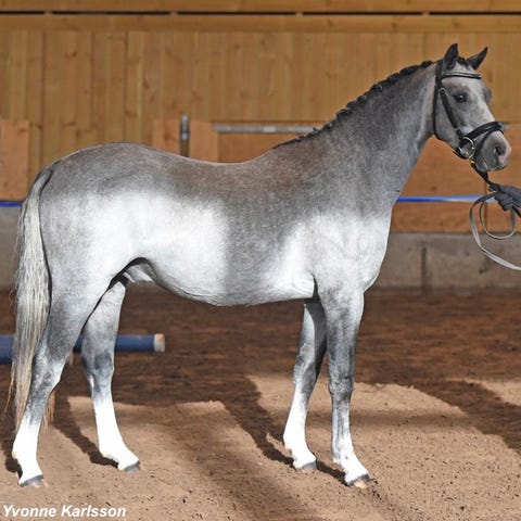 Elegant hingst med god styrke og bevægelse, særligt velegnet til dressur. Forventes at ende omkring 135 cm i stangmål.