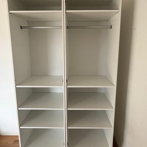 Brugt som på billedet, men kan omkonfigureres. De to store neders er med udtræk og 60cm høje - resten er med hylder og er 40cm høje.