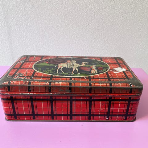 Kagedåse med motiv af skottehund, pæn indvendigt og udvendigt, ingen rust mv, kan sendes