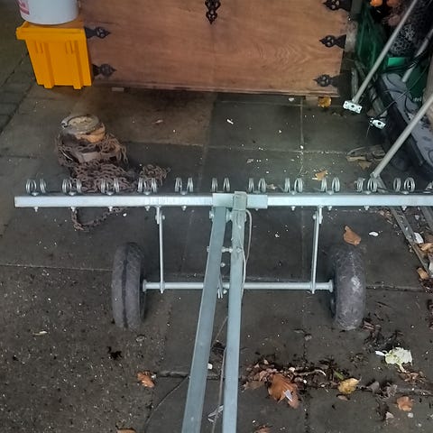 Plænelufter med hjul og håndtag til manuel brug. Udstyret med metalpigge til luftning af græsplæner. Sort farve og robust konstruktion. Designet til at lette vedligeholdelse af plæner ved at forbedre luft- og vandgennemstrømning i jorden.