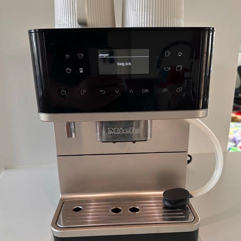 Miele CM 6300 espressomaskine i hvid farve. Den er brugt men er i rigtig god stand. Den har brygget ca. 7500 kopper - så der er langt til de 50.000 den er testet til. Maskinen har et digitalt display og betjeningsknapper på fronten. Den er designet til at lave espresso og andre kaffedrikke med mulighed for justering af mælkeskum via slange. Maskinen har en kompakt form og et moderne design.