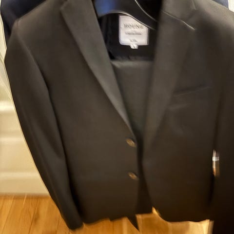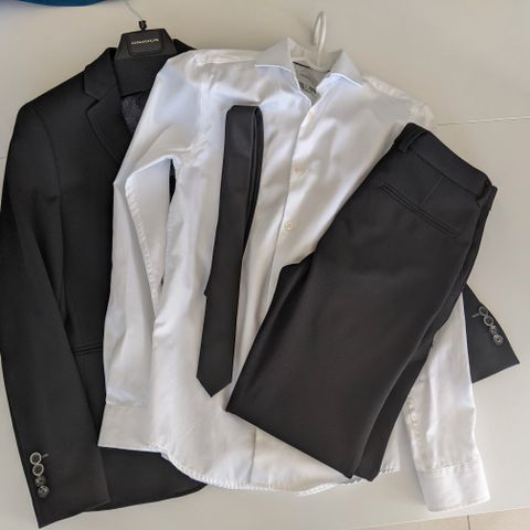 Mørkegråt jakkesæt med hvid skjorte og slips. Som nyt.