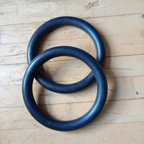 Gymnastikringe med tilhørende stropper i sort materiale. Kan bruges til træning og styrkelse af overkroppen.