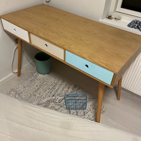 Skrivebord med 3 skuffer, stål ben, i lyst træ, og en god størrelse.
