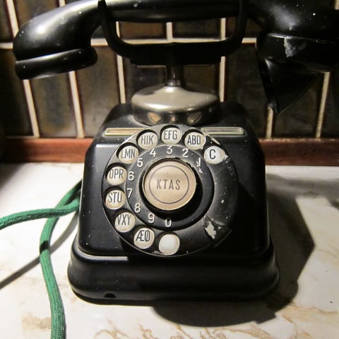 KTAS Telefon med drejeskive fra 1950,erne, lavet af bakelit med ledning og stik.