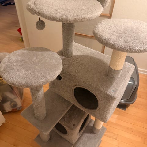 Sort kattekradsetræ med en hule i bunden og en platform øverst.