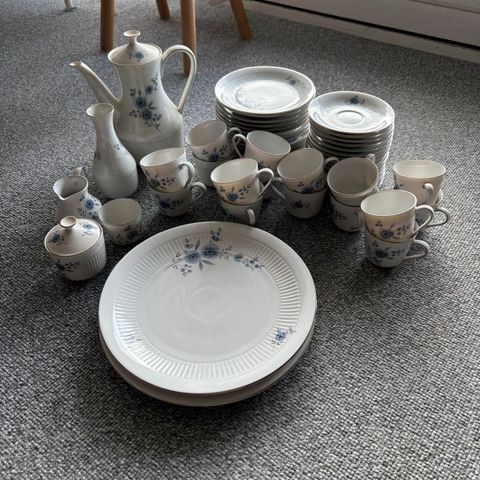 Meget Smukt stel dekoreret med blomstermønster og guldkanter og inkluderer tallerkener, fade, skåle og sovseskåle. (Tallerkener til 10-12 personer)