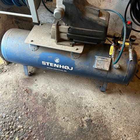 Stenhøj Kompressor model 150/10 med en kapacitet på 90 liter. Kompressoren er blå og produceret af Stenhøj. Den er velegnet til forskellige formål, hvor trykluft er nødvendig.