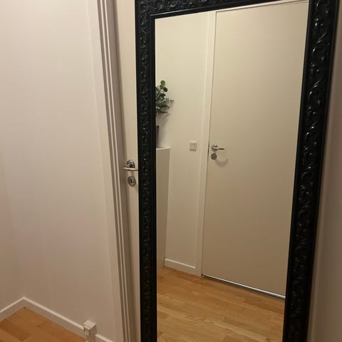 Kan stå op ad væg eller placeres på kommode, som vist på billederne.