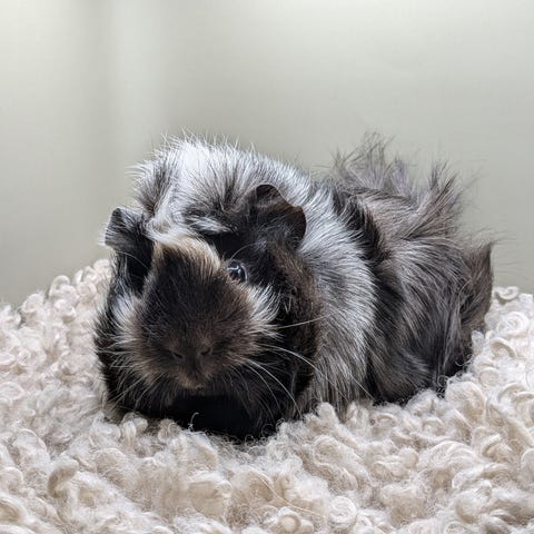Han er af racen Texel og bliver langhåret med krøller og med Californiaaftegn. Desuden er han med satin pels.