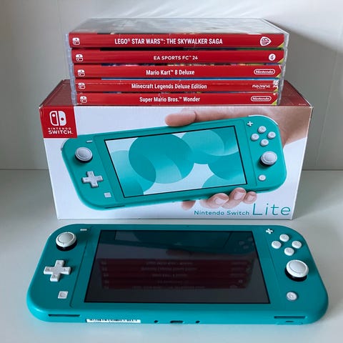 Nintendo Switch Lite turkis håndholdt konsol med spil og hukommelseskort