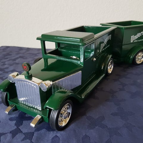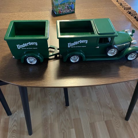 Underberg lastbil - uundværlig til hjemmebaren. En smule patina, men komplet og spilledåsen virker fint. Køler emblem er knækket med medfølger, men jeg vil ikke lime den, hvis den skal sendes og kan knække af. Har taget et par nærfotos for stand. Lugter ikke af røg, men jeg har rengjort den for den var lidt fedtet i overfladen men er nu pæn
