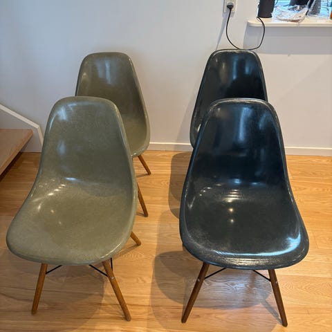 Skallerne er originale vintage fiberglass. Understel (klassisk Eiffel-base i maple) er senere udskiftet, hvilket er almindeligt for denne type stole og ikke påvirker autenticiteten af skallerne.