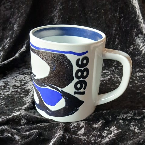 Stort Royal Copenhagen Årskrus krus fra 1986 i keramik med blå og sorte dekorative mønstre. Kruset har en hvid basefarve og et robust håndtag.