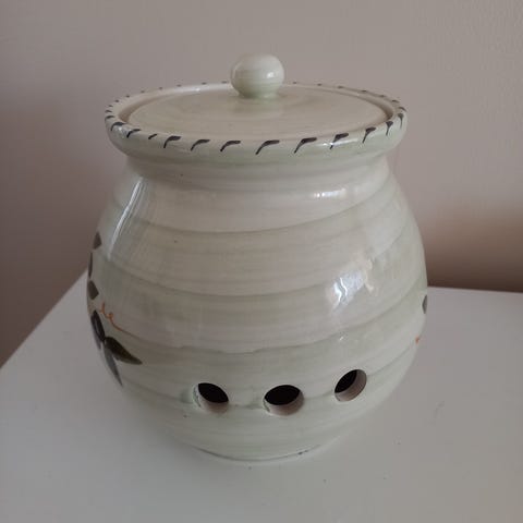 Kande og hvidløgskrukke i den smukke grønne farve. De to dele er af keramik.