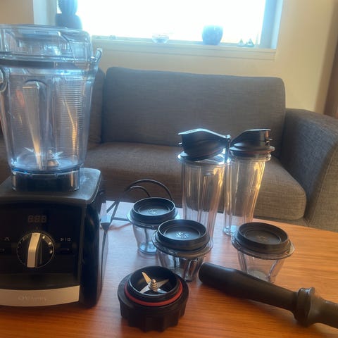 Vitamix Blending Cup Startkit indeholder to gennemsigtige blendingkopper med låg og en knivmekanisme. Kopperne er designet til brug med Vitamix blender og egner sig til blanding og opbevaring af drikkevarer.