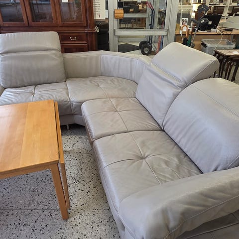 Chr. Firtal fyrretræs hjørnesofa, stof er slidt på armlæn.