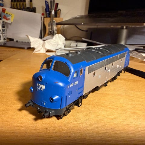 Heljan. MY 1131. NEG V170 I str. H0. Brugt, men i pæn stand uden kasse. Der er to sorte pletter på taget, hvor der har været nogle ridser. Den kører rigtigt fint. Der er hvidt lys i kørsel retningen og rødt lys bagtil. Den er til DC jævnstrøm (analog)