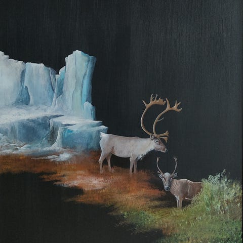 Eget arbejde, akryl på lærred, indrammet i svæveramme i sølv. Billedet måler 60 cm x 80 cm.