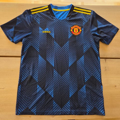 Manchester Uniteds udebanetrøje 2021–2022 er en af de trøjer, der visuelt siger mere, end sæsonen sportsligt endte med at gøre. Et mørkt, næsten grafisk udtryk, klare gule kontraster og et design, der tydeligt signalerede ambition – også i en periode, hvor klubben stadig ledte efter stabilitet.